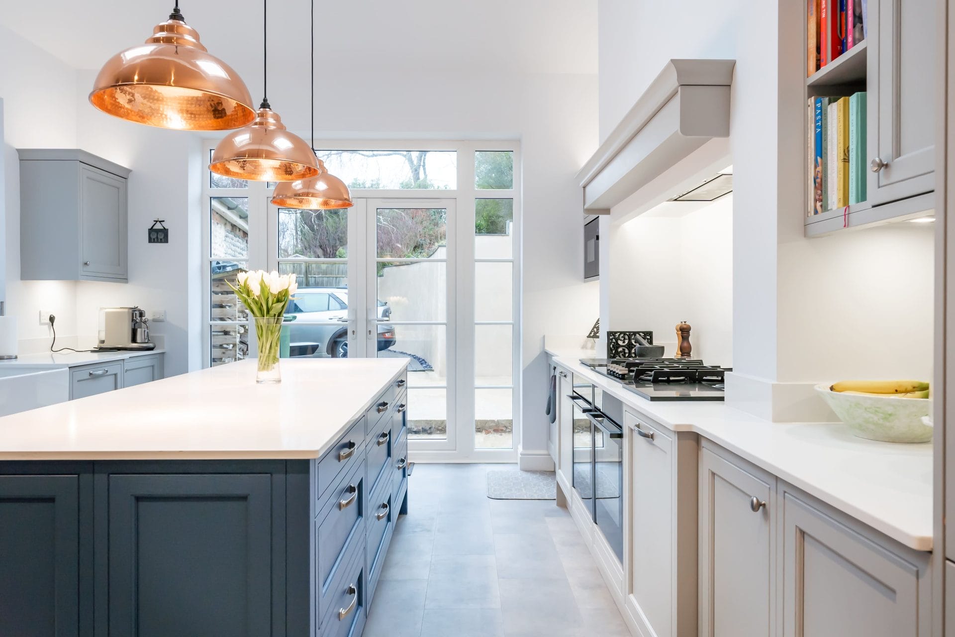 The island serves as the centrepiece of the room, painted in a striking Windsor Blue. This bold yet timeless choice anchors the space beautifully, creating depth and contrast against the softer tones of the perimeter cabinetry.