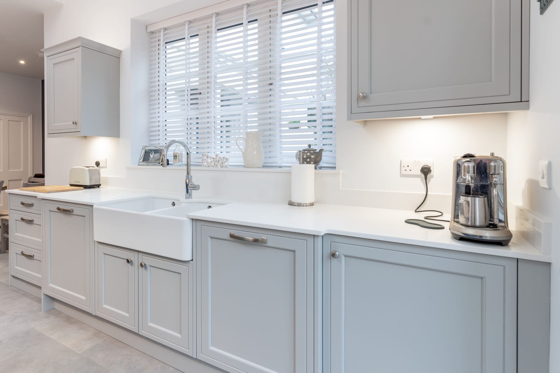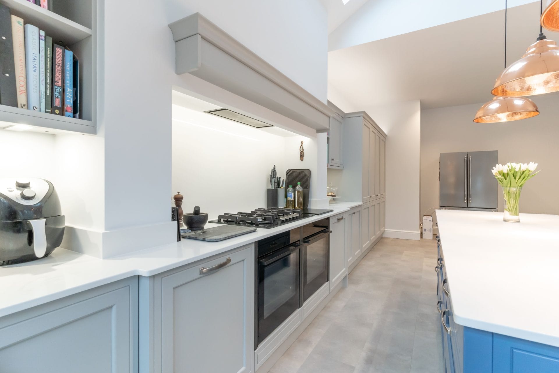 To complete the look, Mr White selected 20mm quartz worktops in Snow, delivering a crisp, clean surface that complements both the Light Grey cabinetry and the deep blue island. Quartz is not only visually striking but highly durable, ideal for keen cooks who need a robust surface for daily use. The streamlined 20mm profile keeps the overall aesthetic modern and refined. Another standout feature is the large mantle, which frames the cooking area beautifully. It adds architectural presence and creates a natural focal point, giving the kitchen a sense of structure and balance.