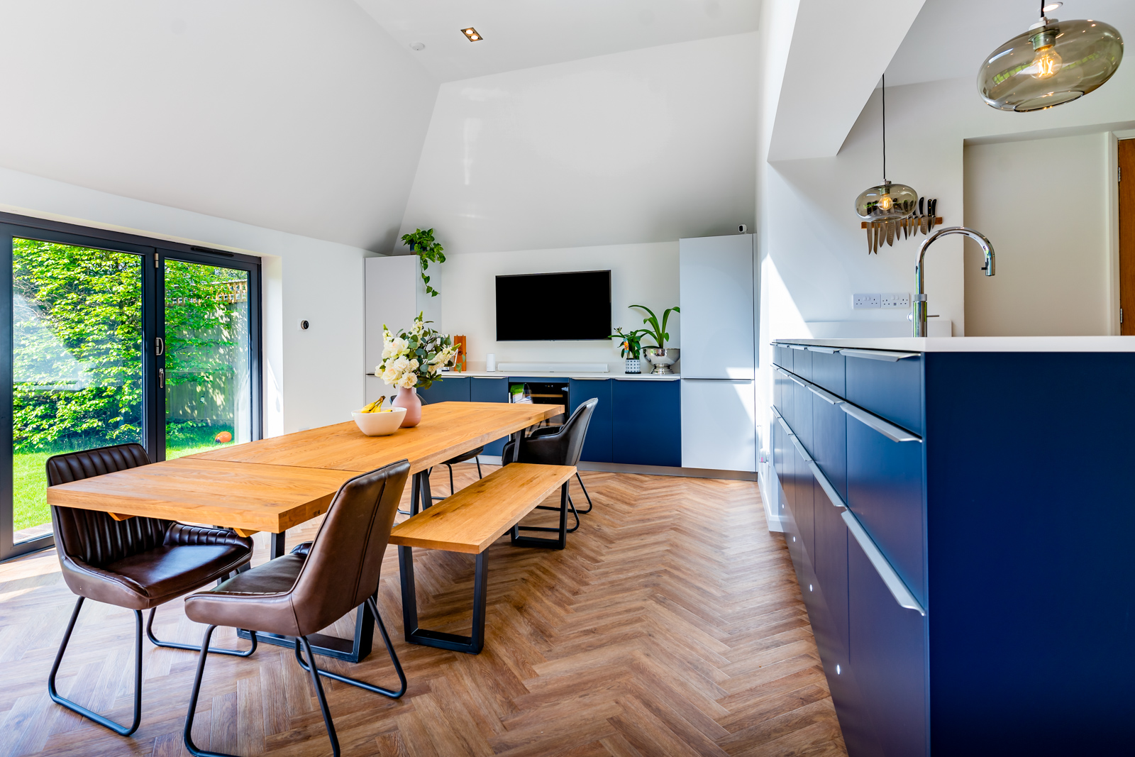 Set across two levels, this showstopping kitchen is perfectly balanced, superbly practical and effortlessly stylish. The two-tone colour scheme is crucial to the success of the design, with the deep yet warm Navy blue establishing a flow throughout the room while the Moonlight Grey retains the bright and open feel of the space. Next to the fresh and lively colour scheme, a mirrored glass splashback and exquisite pendant lights add a subtle touch of glamour and luxury.