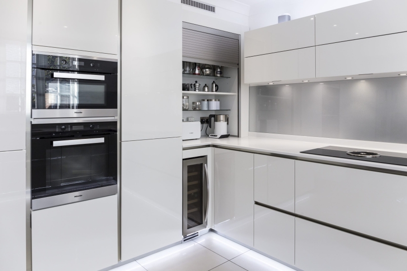 Pull out storage solutions make this kitchen remarkably efficient to use as well as keeping the space minimal and clutter-free. A bespoke roller shutter unit cleverly conceals a breakfast area that houses a toaster and kettle. Featuring Miele appliances and a sleek Bora hob, this kitchen is the peak of functionality whilst delivering stunning aesthetics and operating seamlessly.