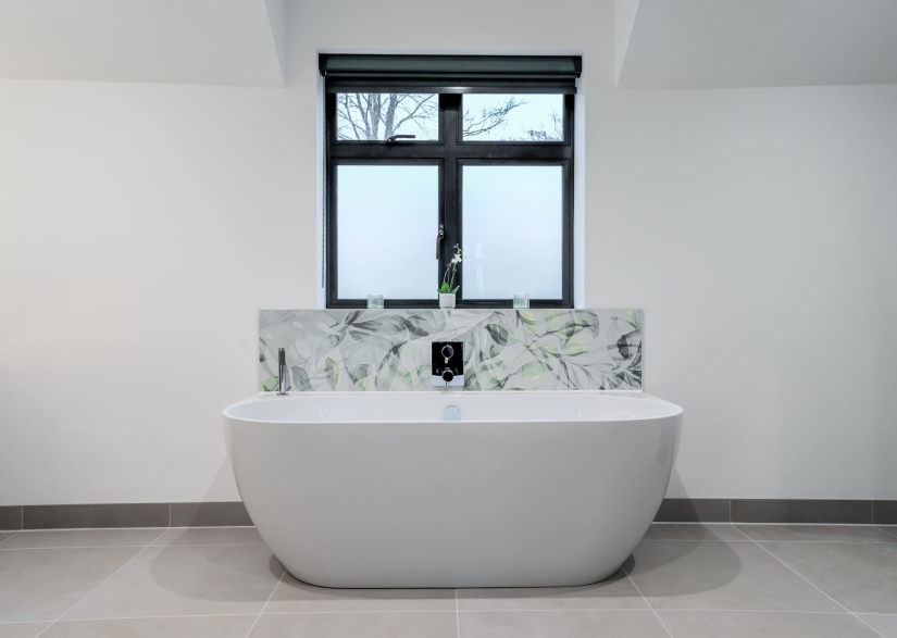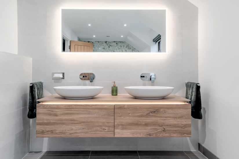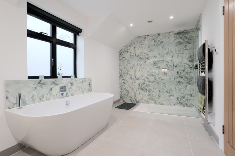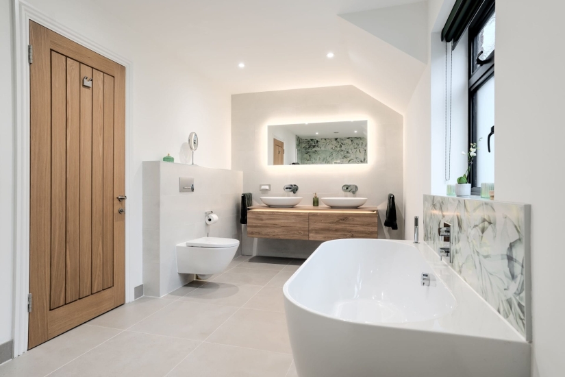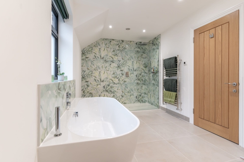 The Villeroy and Boch Legato vanity unit provides sleek storage, while the Villeroy and Boch Loop and Friends washbasins are both functional and stylish. A luxurious Waters bath and Matki shower tray offer relaxation, while the feature wall with Villeroy and Boch Urban Jungle tiles adds a bold touch. The HIB mirror, complete with a built-in radio, has become a family favourite, adding both convenience and enjoyment to daily routines. Keuco Moll accessories bring elegance to the space, while the layout maximises functionality for the whole family.