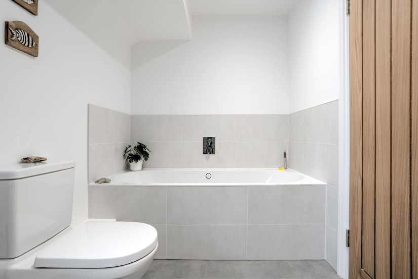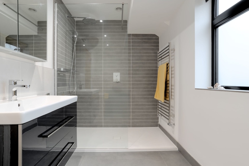 The bathroom’s design blends sophistication with practicality. The Villeroy and Boch Avento vanity unit offers both style and storage, fitting seamlessly into the space. The Villeroy and Boch Oberon bath is a striking centrepiece, inviting relaxation with its freestanding design. The walk-in shower, with its minimalist design, is paired with modern fixtures to create a serene, functional space. The HIB mirror cabinet not only adds elegance but also provides ample storage, keeping the space clutter-free. The overall design is one of timeless luxury, combining sleek lines and high-end materials to create a bathroom that feels both indulgent and welcoming.