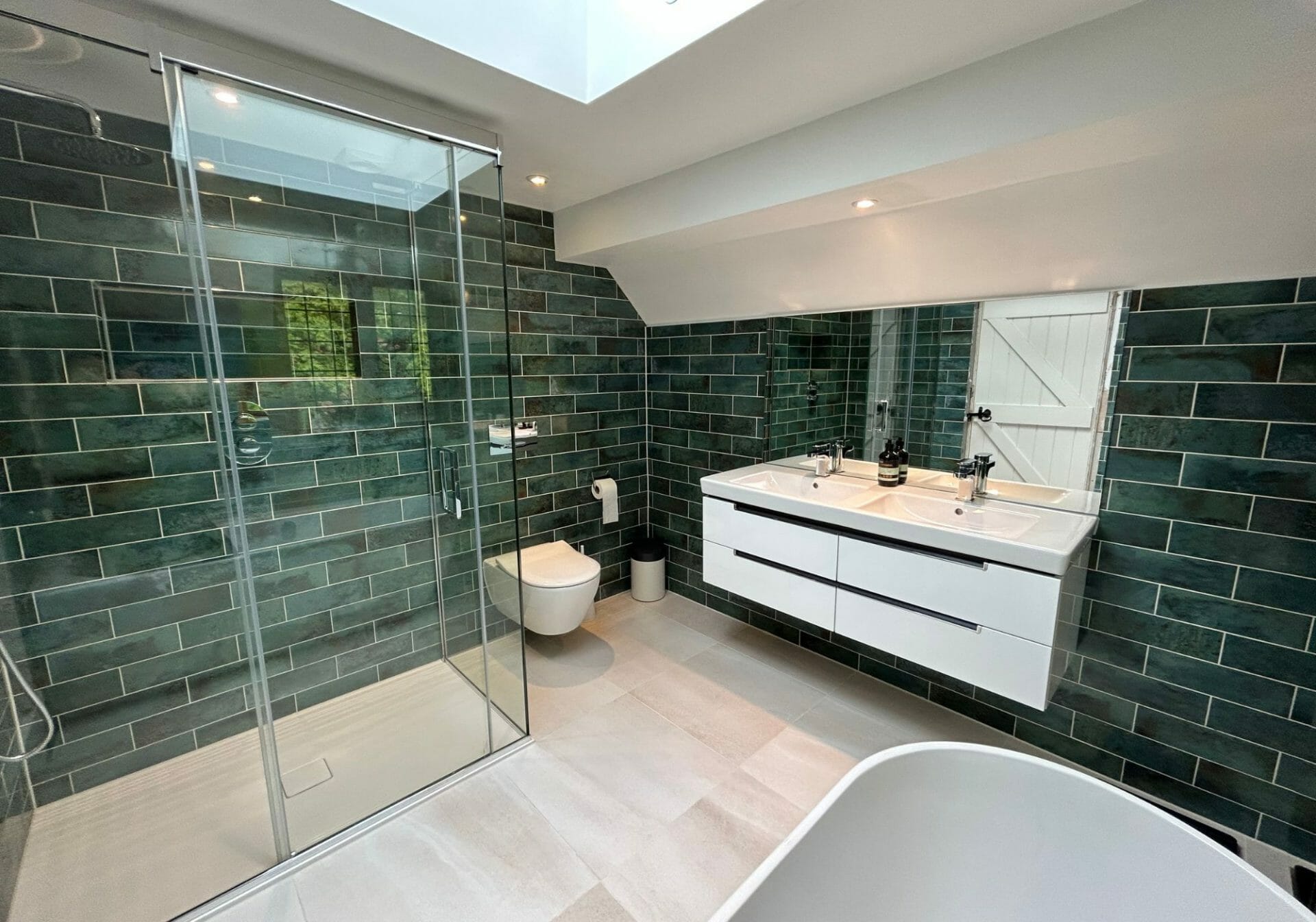 The showstopping Wightwick Green metro tiles from Ca’ Pietra make a dramatic impression upon entering this luxurious master en-suite. They bring an immediate sense of opulence and grandeur to the design. The extravagant aesthetic continues with the impressive Waters Ebb corner bath and fabulous Villeroy & Boch double basin. The sleek chrome Vado Zoo fixtures, JIS designer towel rail, and minimal Matki shower enclosure bring a fresh, contemporary edge to the magnificent scheme.
