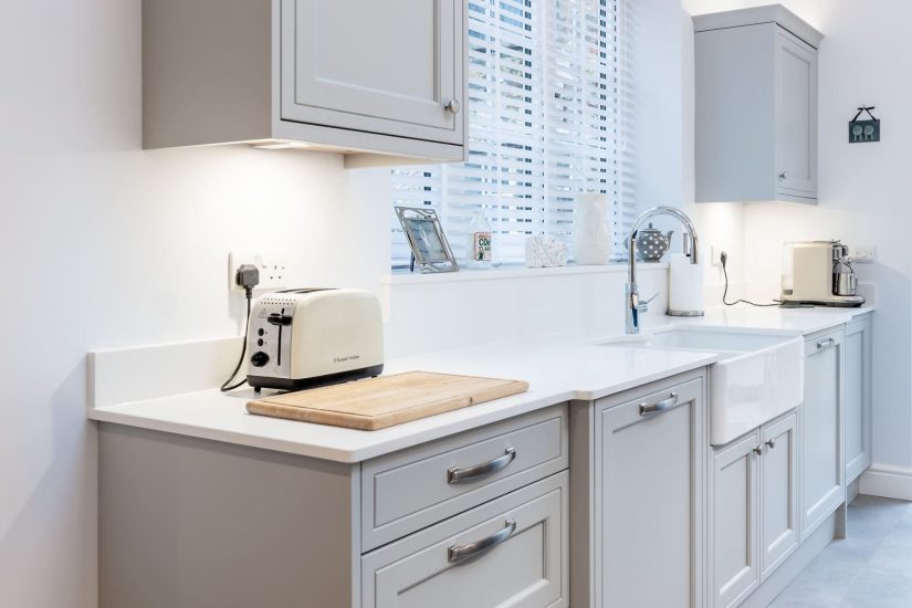 The finished kitchen features a beautifully crafted Masterclass Kitchen; one of our newest suppliers, with Hawksmoor doors painted in Light Grey paired with a Portland Oak carcass. The result is calm, elegant and bright, while still offering warmth and depth through the internal cabinetry finish.