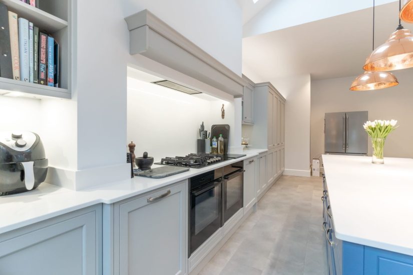 A standout feature is the large island, painted in Windsor Blue and finished with decorative posts and panels to give it a sophisticated, furniture-like feel. Topped with crisp 20mm Snow quartz worktops, it provides generous prep space for keen cooks and naturally becomes the hub of the room. The statement mantle over the cooking area completes the look, creating a beautiful focal point and giving the space a strong architectural presence.