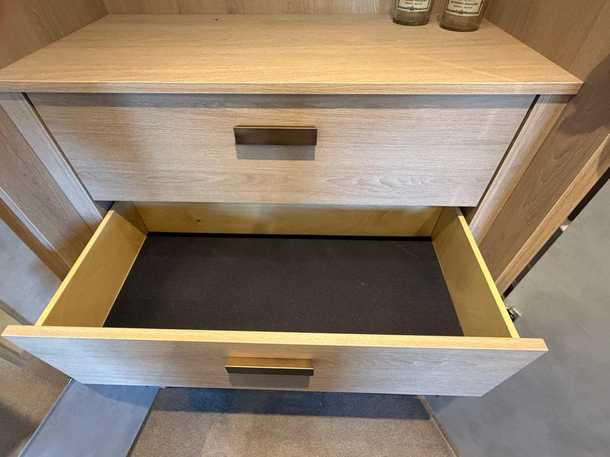 Gloss lacquer silver, carcass blonde wood, handles in brushed brass