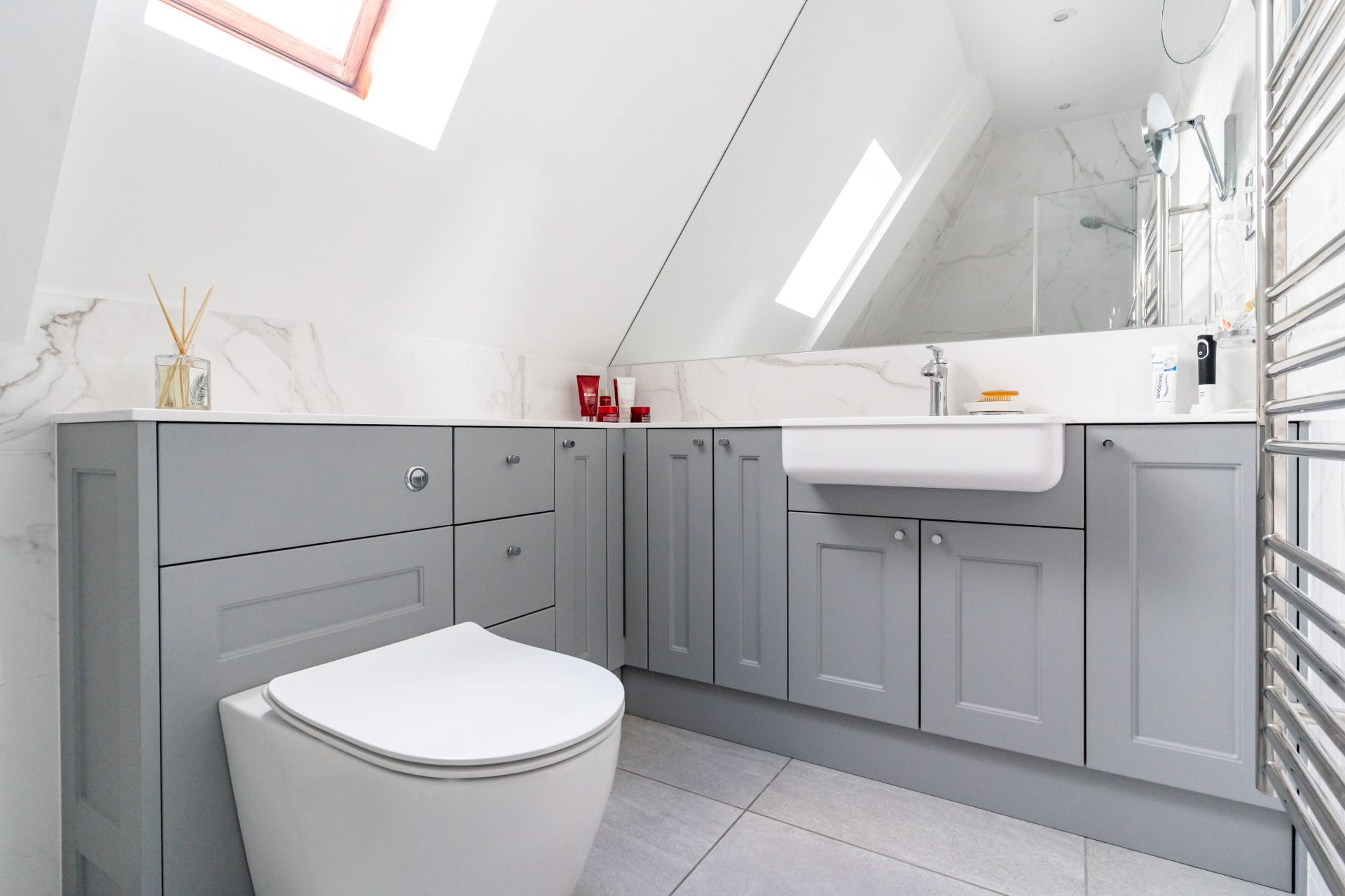 Elsewhere in the home, the bathroom renovation followed the same careful approach. We used bespoke Calypso furniture to maximise storage beneath a sloping ceiling, creating a streamlined layout that feels open and uncluttered.